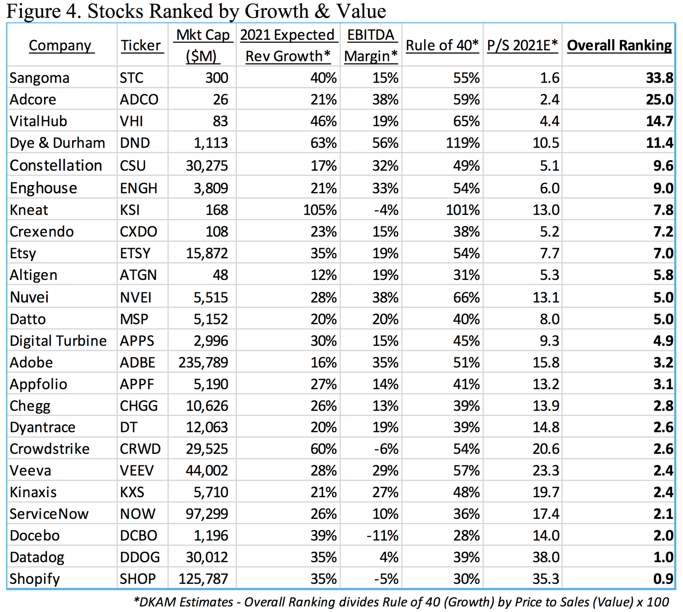 In figure 1 below, we highlight selected companies in Canada and the US that look compelling strictly based on the Rule of 40.